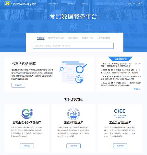 為適應“互聯網+”國家戰略的總體趨勢和發展要求,提升服務食品行業的信息交流、數據應用及綜合技術能力,更好地為我國食品行業發展提供技術支撐和解決方案,中國食品發酵工業研究院(以下簡稱“食品院”)數據服務平臺于7月30日上線試運行。食品院數據服務平臺(http://www.sinofoodcloud.com)提供圍繞核心業務的數據信息服務,涵蓋標準/技術法規、GI(血糖生成指數)、釀酒原料和工業微生物4個專項數據庫檢索服務和行業數據查詢服務。