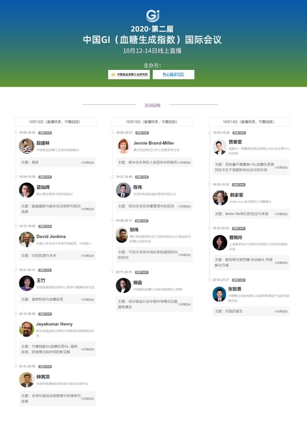 10月12-14日,第二屆中國 GI(血糖生成指數)國際會議以線上直播形式與大家見面,吸引了上萬人觀看,反響熱烈!自2019年9月,第一屆中國GI(血糖生成指數)國際會議在食品院召開,獲得了行業強烈反響。今年,中國食品院與熱心腸研究院再度合作,舉辦第二屆中國 GI(血糖生成指數)國際會議。