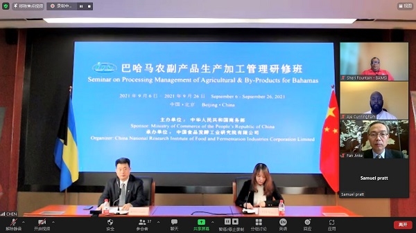 2021年9月6日,由國(guó)家商務(wù)部主辦、中國(guó)食品發(fā)酵工業(yè)研究院承辦的“巴哈馬農(nóng)副產(chǎn)品生產(chǎn)加工管理研修班”成功舉辦了線上開(kāi)班儀式。中國(guó)駐巴哈馬特命全權(quán)大使戴慶利、巴哈馬農(nóng)業(yè)與海洋資源部常務(wù)秘書(shū)(副部級(jí))喬爾·劉易斯、食品院總經(jīng)理董建輝、中國(guó)駐巴哈馬經(jīng)濟(jì)商務(wù)參贊樊金科出席了開(kāi)班儀式,食品院總經(jīng)理助理羅燕琴主持開(kāi)班儀式。