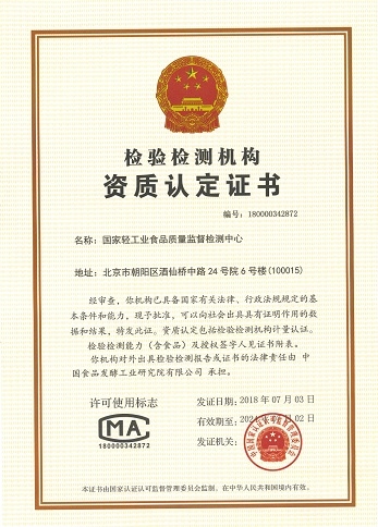 國家食品質量監督檢驗中心(以下簡稱中心)掛靠在中輕食品檢驗認證有限公司,成立于1989年,是由國家質量監督檢驗檢疫總局授權的從事食品檢驗的國家級質檢中心,擁有CMA資質認定、CAL授權 及CNAS認可證書。授權的食品及相關產品覆蓋酒類、飲料、糖果、罐頭、焙烤食品、 冷凍飲品、調味品、肉制品、水產加工品、食品添加劑及食品包裝材料共計400余種,檢驗參數覆蓋理化檢驗、營養成分及保健食品功效成分、農獸藥殘留、重金屬及化學污染物、生物毒素、食品添加劑、非法添加物、微生物學及分子生物學檢測等領域共2000多個,在國內同行業處于領先地位。